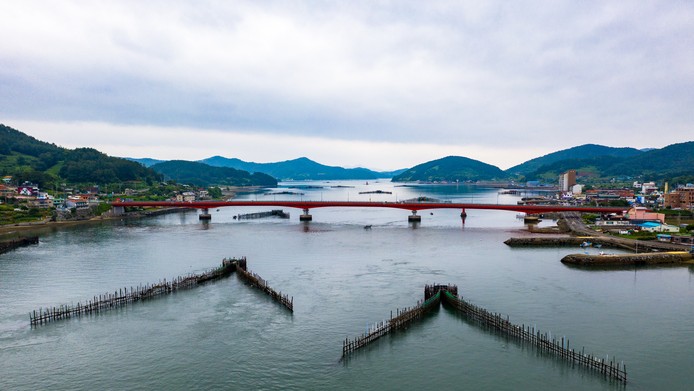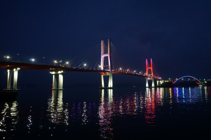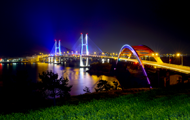 멀리 남해까지 오셨는데 대한민국에서 가장 아름다운 다리를 안보고 가서는 안되겠죠? 삼천포대교는 우리나라에서 가장 아름다운 다리로 선정되었습니다. 삼천포와 남해 창선을 연결하는 연륙교로 '삼천포-초양섬-늑도-모개섬-창선'으로 연결하는 5개의 다리로 우리나라 최초의 섬과 섬을 잇는 다리로 각 다리마다 다른 기법이 적용되어 건설되었습니다. 낮에는 바다와 섬이 조화롭고 밤에는 아름답게 빛나는 야경이 아름다운 곳으로 우리나라 아름다운길 100선에 선정되기도 했습니다.