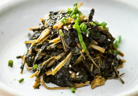 - 불린 곤드레는 한입 크기로 자르고, 참기름 + 마늘 + 소금을 넣고 가볍게 볶아줍니다.