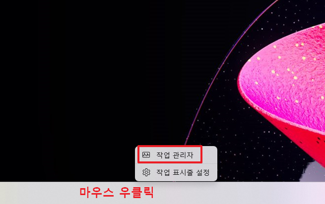1. 윈도우 작업표시줄을 우클릭하여 '작업관리자'를 선택합니다.