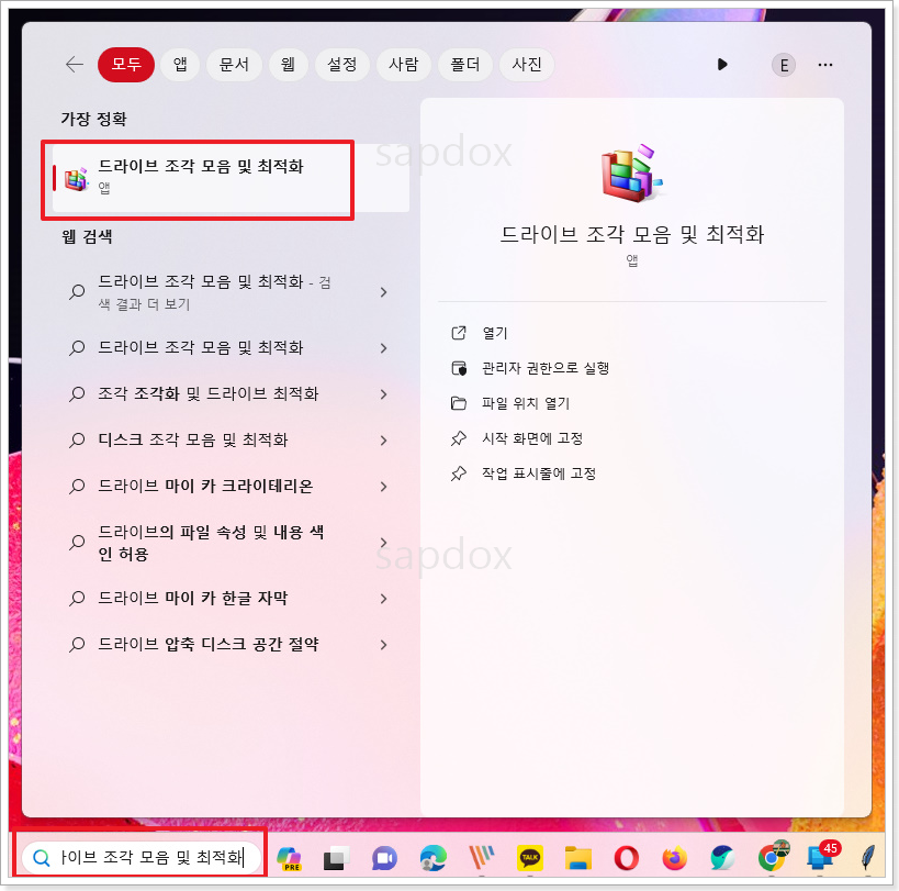 1. 윈도우 작업표시줄 검색창에 '조각 모음' 또는 드라이브 조각 모음 및 최적화를 입력 후 '드라이브 조각 모음 및 최적화'를 선택합니다.