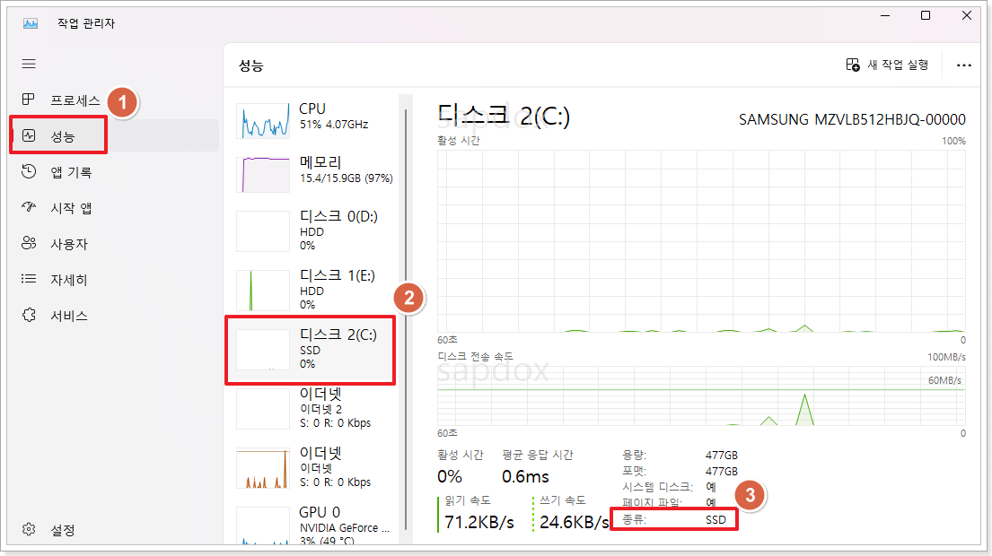 2. '성능' 탭을 선택하고 확인하고자 하는 디스크를 선택하면 우측 하단에 사용중인 컴퓨터 드라이브 유형이 표시됩니다.