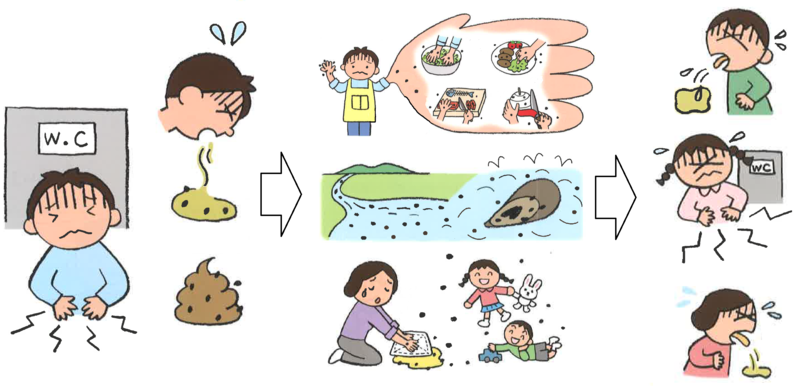 | 환자의 분변, 구토물 접촉 | 감염자의 배설물에 직접 닿거나, 바이러스 입자 흡입 |