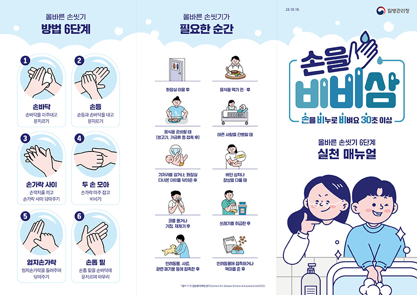 - 외출 후, 화장실 사용 후, 음식 준비 전 30초 이상 흐르는 물에 비누로 꼼꼼히 씻기