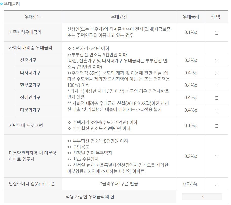 가족사랑우대금리 0.1%P 신혼가구 우대금리 0.2%P 다자녀,한부모,장애인,다문화가구 우대금리 0.4%P 주택가격 3억원(수도권 5억원)이하, 부부합산 연소득 45백만원 이하 0.1%P 미분양관리지역 내 미분양 입주자로써 부부합산 연소득 8천만원 이하 0.2%P 안심주머니 앱 쿠폰(금리우대 쿠폰발급) 0.02%P