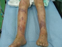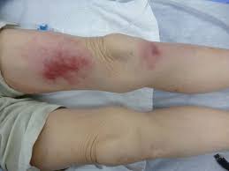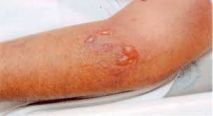 감염 부위 주변에 물집, 피부 괴사, 자반
