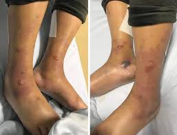비브리오 불니피쿠스 감염으로, 혈류로 침투해 패혈증과 피부 괴사를 유발하며 생명을 위협합니다.
