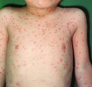 발열 이후 1~2일 사이에 피부에 발진이 생기며, 초기에는 평평한 붉은 반점이 생기고, 시간이 지남에 따라 가렵고 투명한 수포로 발전합니다. 이후 수포는 파열되어 딱지가 생기게 되며, 이러한 과정이 반복적으로 진행되면서 다양한 단계의 발진이 동시에 나타나는 특징이 있습니다.