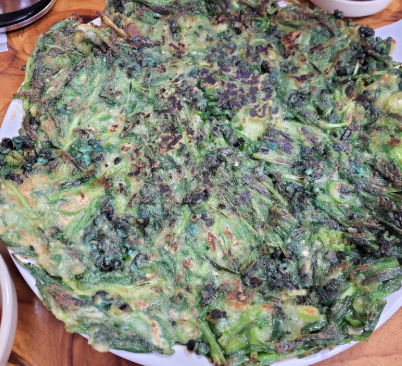 ④ 달군 팬에 식용유를 두르고 반죽을 얇게 펴 올린 뒤 중약불에서 앞뒤로 노릇하게 부칩니다.