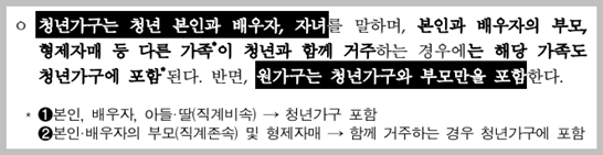 원가구는 청년가구와 부모만을 포함한 가구를 말하고 그외의 가구는 모두 청년가구입니다. 예를 들어 청년가구와 형제, 자매가 함께 거주한다면 이는 청년가구입니다. 하지만 부모와 청년가구 그리고 형제자매가 함께 산다면 이는 원가구가됩니다.