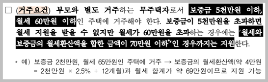 독립세대인 경우 보증금 5천만원 이하 월세 60만원 이하의 주택에 거주.