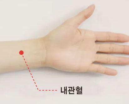 4. 내관혀 지압법 : 손목에서 손바닥쪽으로 두 손가락 넓이만큼 떨어진 곳으로 한번에 3~53~5분 정도 하루에 여러 번 반복해서 눌러줍니다.