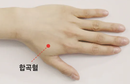 2. 합곡혈 지압법 : 손등에서 엄지 손가락과 검지 손가락 두뼈 사이의 움푹 들어간 곳을 3~5분 동안 천천히 꾹꾹 눌러줍니다.