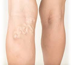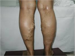 다리 피부 위로 굵고 꼬불꼬불한 정맥이 돌출되어 보이며, 푸른색이나 자색을 띱니다.