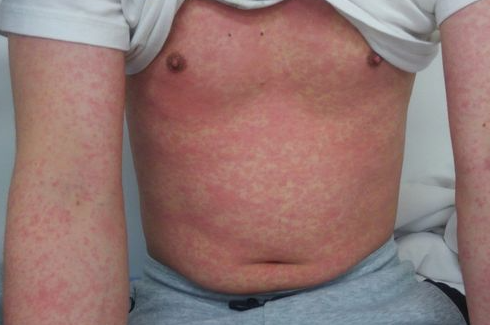 - 특징적인 발진 : 얼굴에서 시작해 목, 몸 전체로 퍼지는 붉은 발진